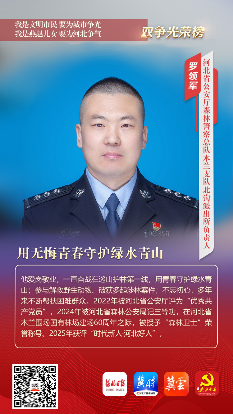 罗领军,男,满族,1987年1月出生,中共党员,河北省公安厅森林警察总队木兰支队北沟派出所负责人、三级警长职务。