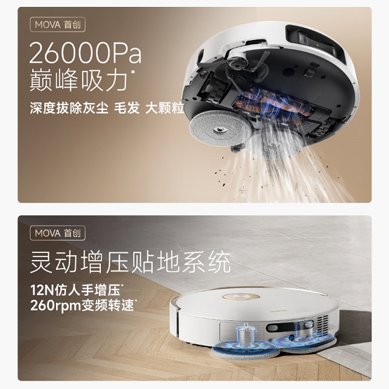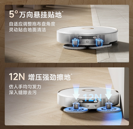 灵动增压贴地系统与边刷、主刷、拖布的三重升降能力,是MOVA P60 Pro提升地形适应性的核心。灵动增压贴地系统能够实现如同越野车悬挂系统般贴合地形能力,带来5°自适应拖布盘角度调整,并可根据智能识别、实时感知的地面污渍状态,实现动态的12N增压擦地,有效清除顽固污渍。