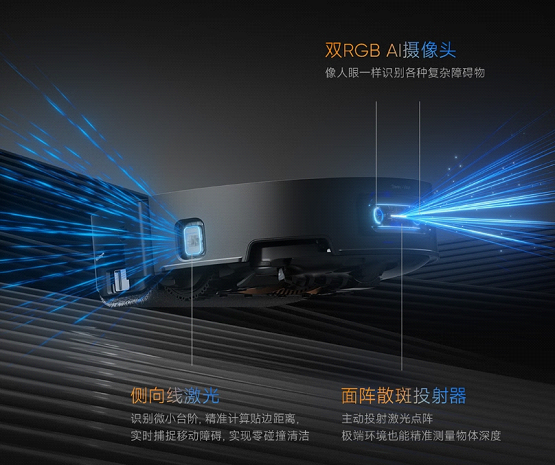 在感知与避障能力方面,追觅X50 Pro履带版搭载主动式双目避障与自升降全景激光雷达组合,成为全向超感系统,实现全向无盲区、可应对低矮全黑场景的精准避障能力。追觅首创主动投射激光点阵,形成的密集点云在极端环境下也可精准测量物体边缘,甚至包含常规扫地机器人难以识别的透明玻璃与深色物体。双目RGB AI摄像头可精准识别障碍物类型,并搭配侧向线激光实施更加精准的贴边清洁策略。