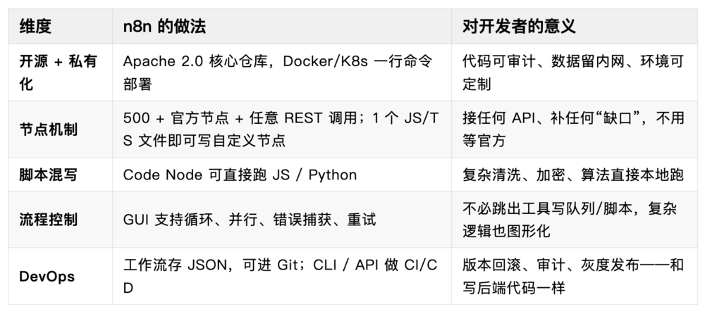 N8N从设计上其实是切中了第一块,他从定位上就天生是给技术人提供“二次开发 + 基建可控”的空间。