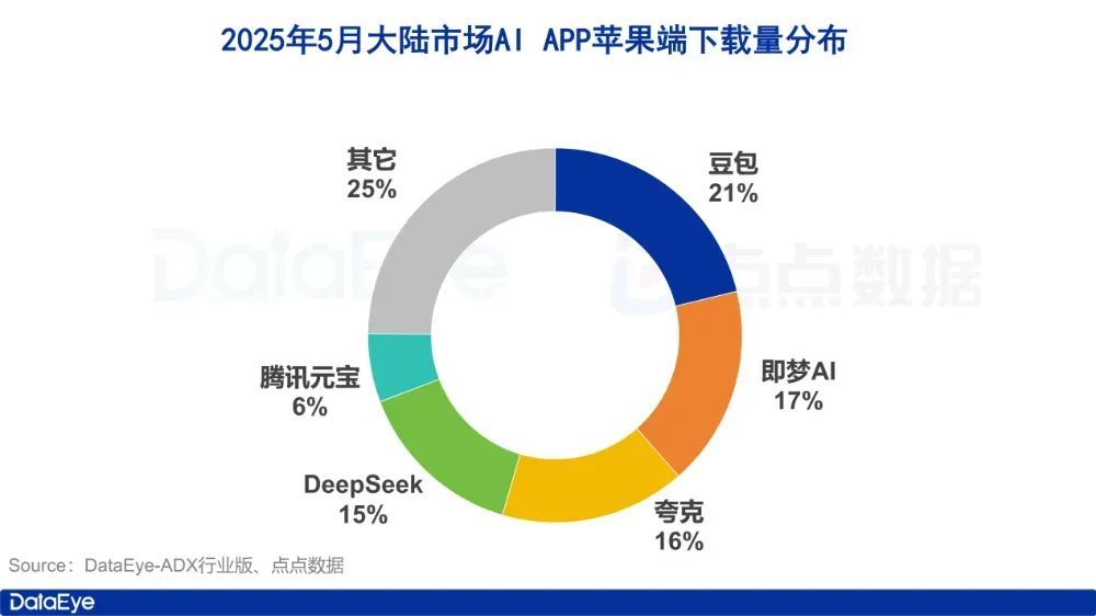 其中,豆包、即梦AI、夸克、DeepSeek与腾讯元宝位列TOP 5,占据了大盘的75%。