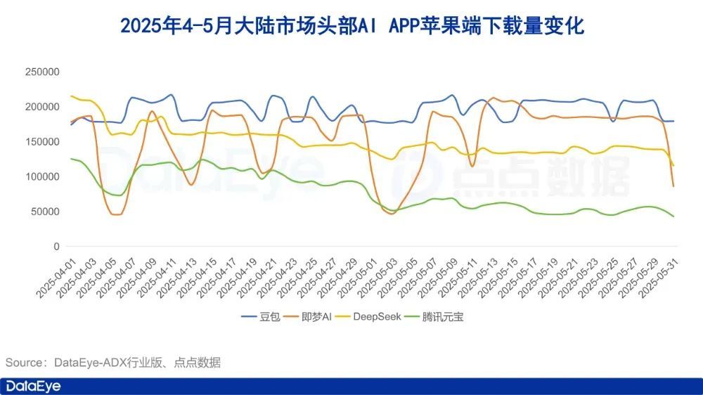 点点数据显示,2025年4月至5月,大陆市场苹果端头部AI APP预估下载量走势由波动状态走向相对平稳。