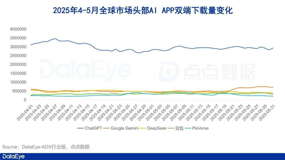 点点数据显示,2025年4月至5月,全球市场头部AI APP双端预估下载量,呈现出ChatGPT一家独大状态。