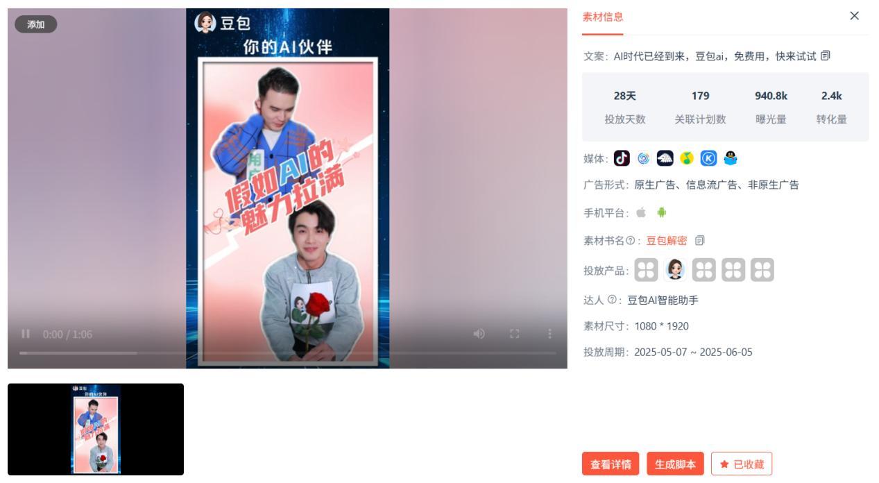 本条素材是豆包在2025年5月份的新增高曝光视频素材,曝光量94.1万,转化量2400。