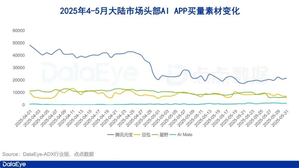 ADX行业版数据显示,2025年5月份,大陆市场头部AI APP买量素材情况出现明显下滑。