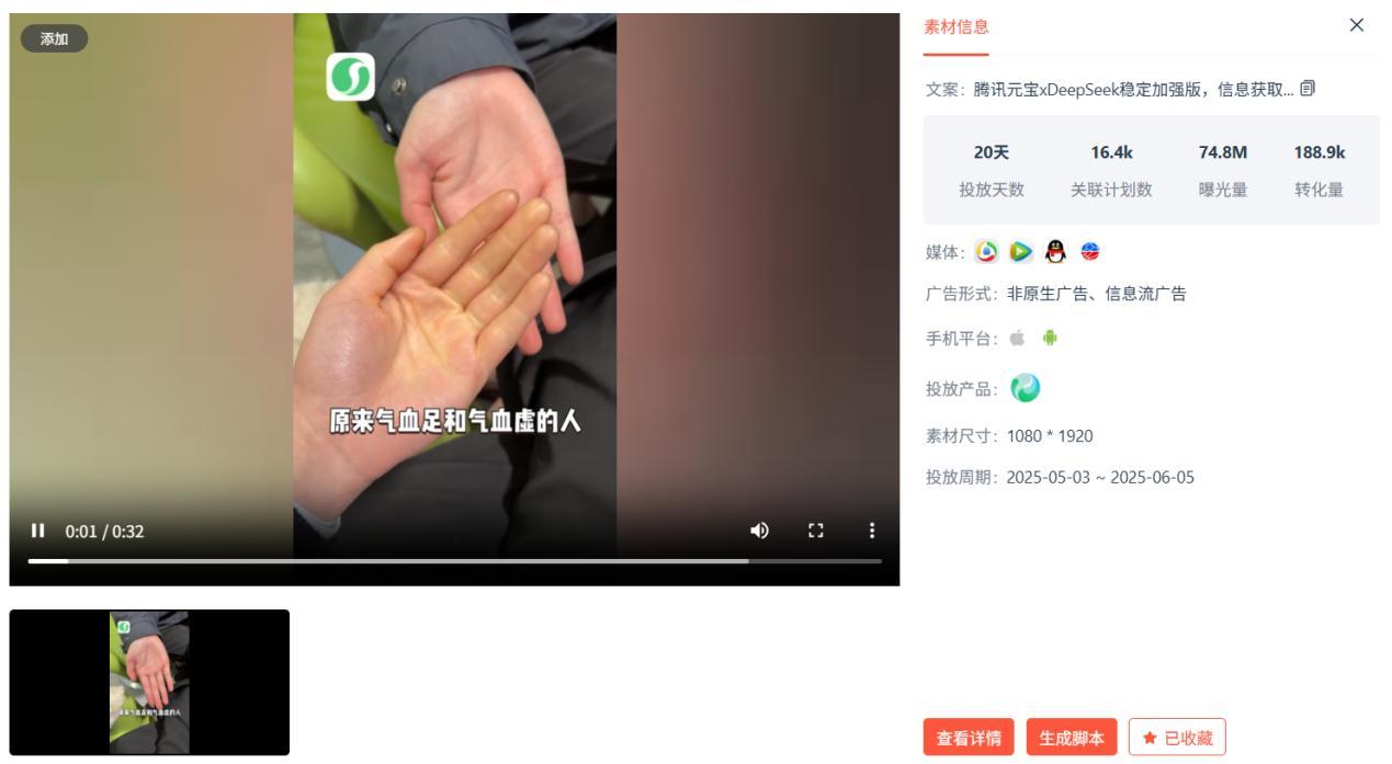本条素材是腾讯元宝在2025年5月份的高曝光视频素材,曝光量7480万,转化量18.9万。
