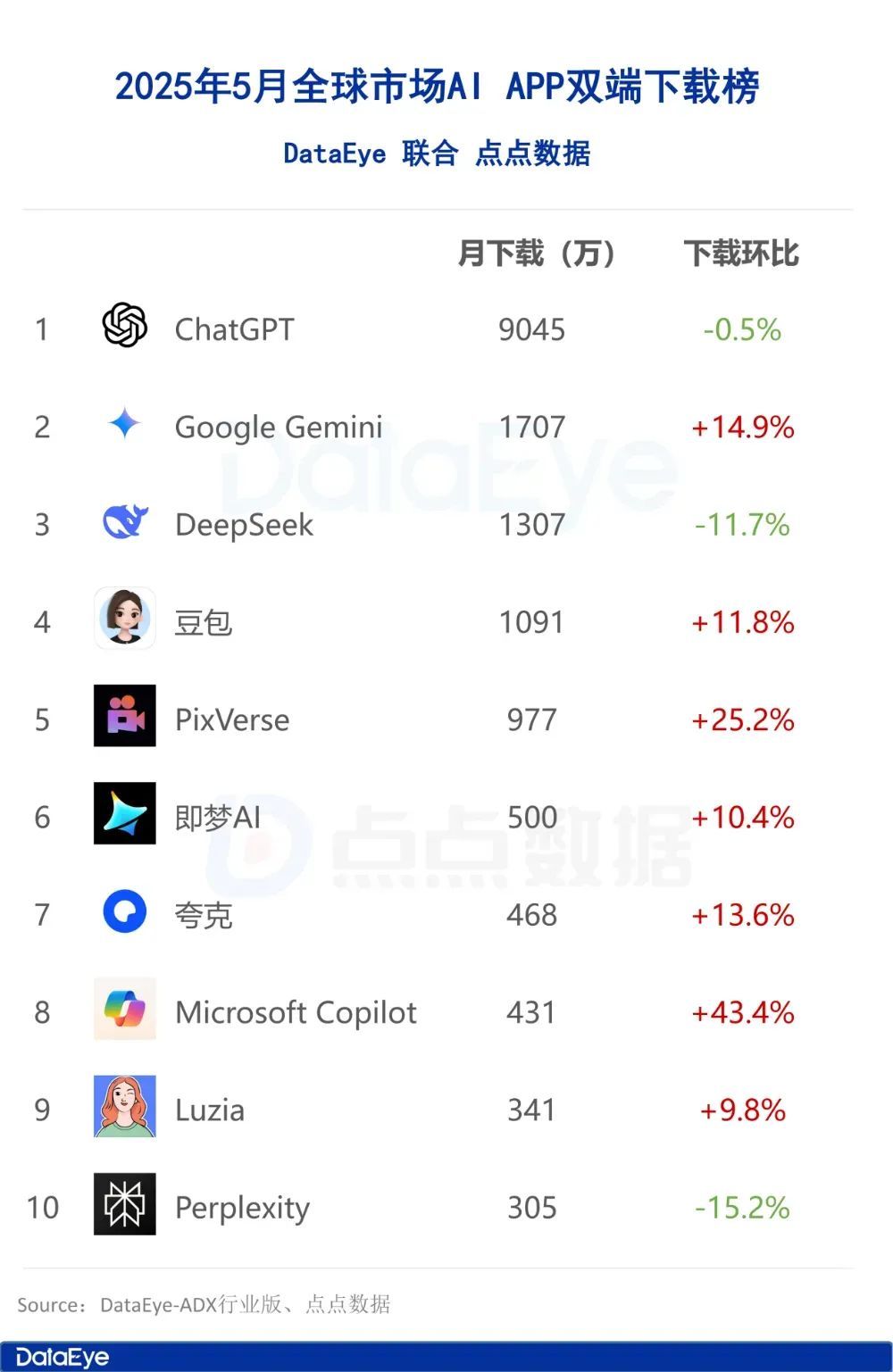 点点数据显示,2025年5月全球市场双端AI APP下载量榜单,由ChatGPT蝉联榜首,下载量达9045万次,环比4月微弱下滑0.5%。