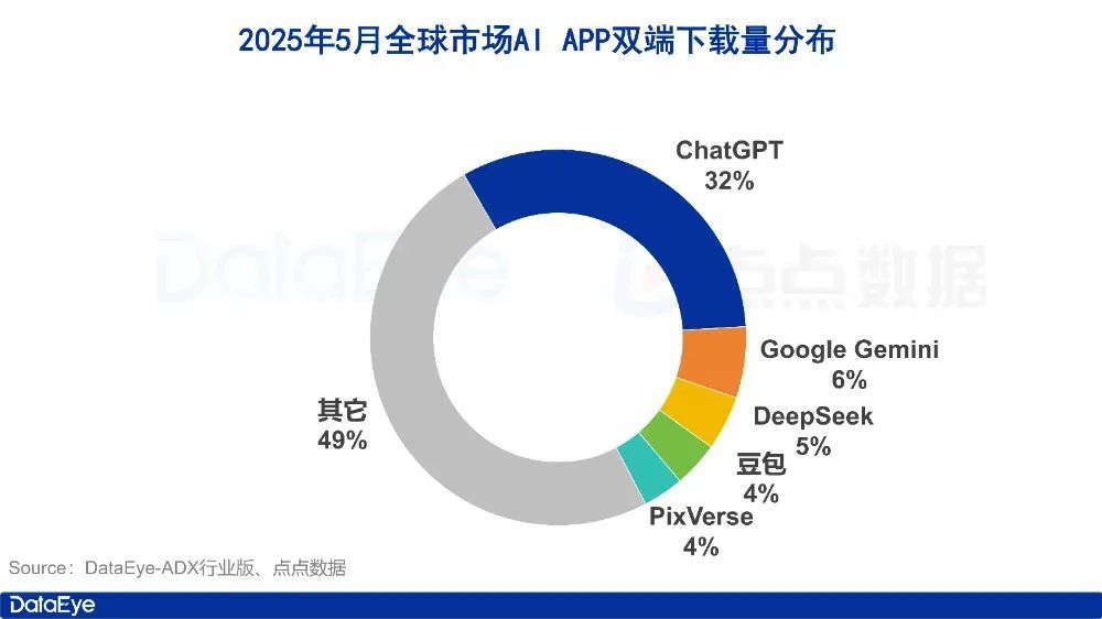 其中,ChatGPT、Google Gemini、DeepSeek、豆包与PixVerse位列TOP 5,占据了全球市场双端AI应用下载量的51%。