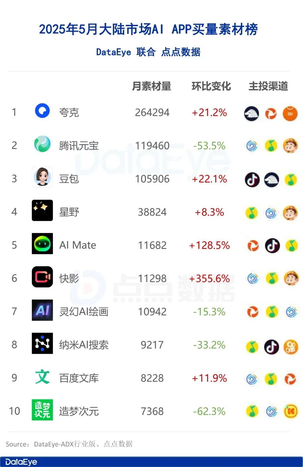其中,夸克、腾讯元宝、豆包、星野与AI Mate位列素材投放榜TOP 5,这5款应用占据了大陆市场整个AI行业月投放素材量的74%。