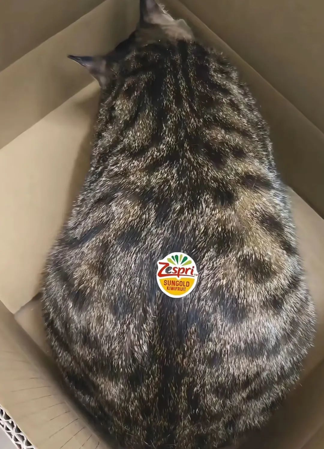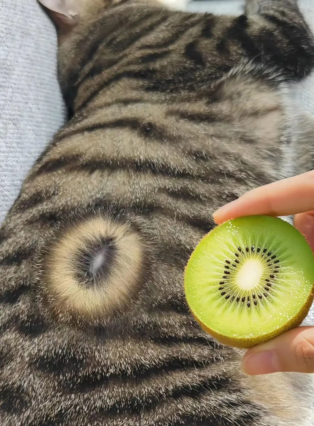 只见猫咪淡定趴在那,背上的毛被扒拉得层次分明,深色的“果皮”、凸起的“果粒”,简直就像猕猴桃本桃!