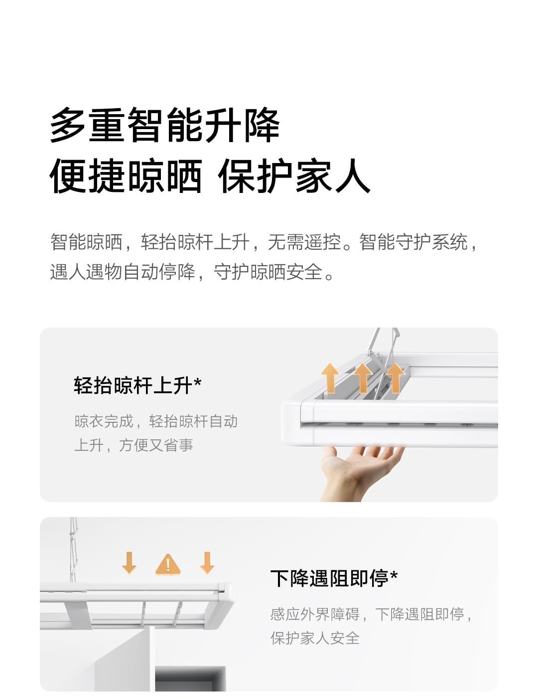 产品配置方面,它提供了晾晒和照明二合一的功能,本体部分内置了 120 颗全光谱灯珠,可以实现接近真实太阳光照的光源素质与色温效果,它还可以配备开放式的晾杆,依靠多结构晾晒设计,它集成了 94 个晾晒位,可以稳定承重 70 斤。同时它还配备了一系列的智能升降功能,可以轻抬晾杆上升,下降和上升过程中遇到阻碍还可以即停或反弹,使用更安心。