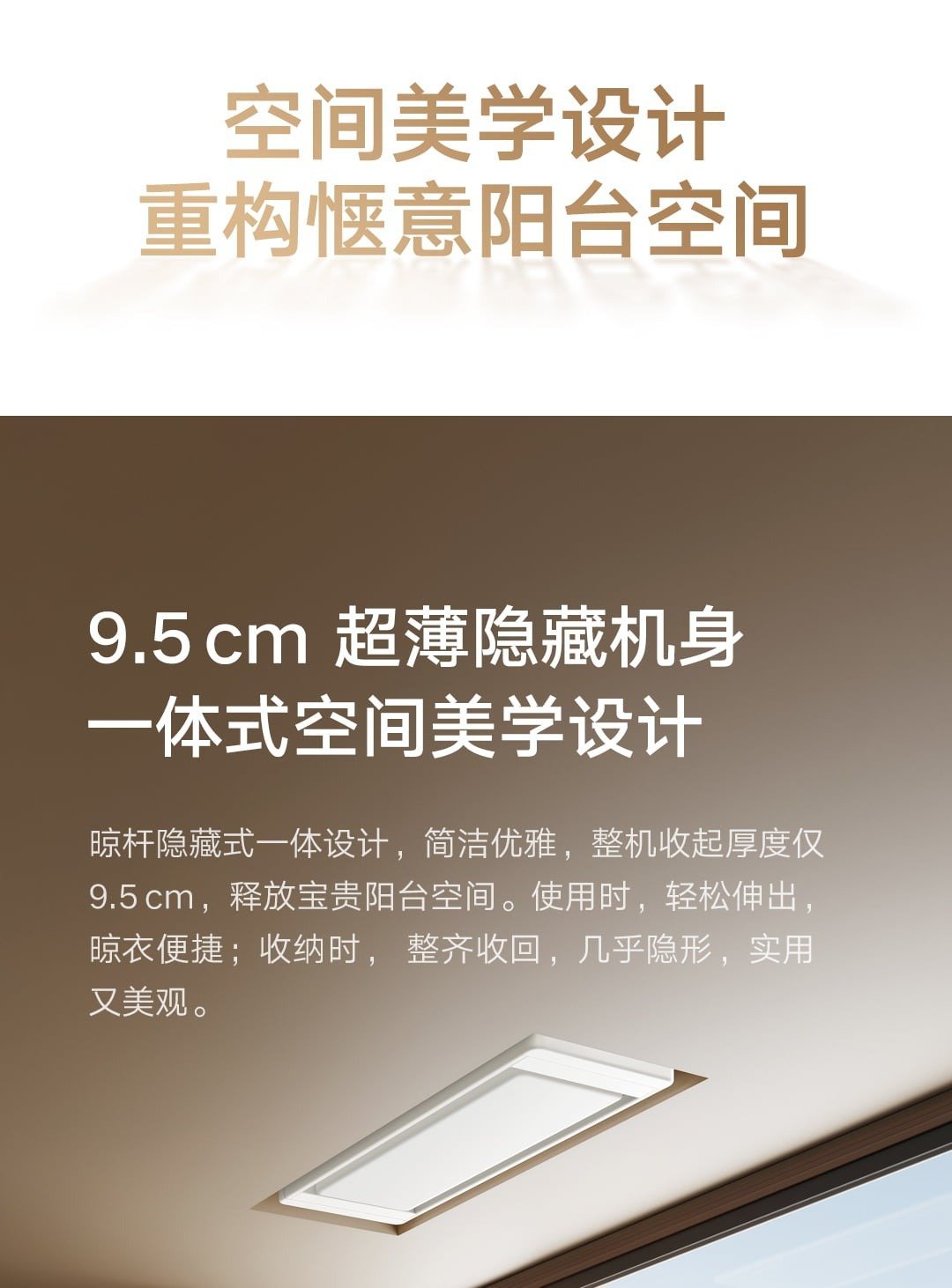 相比于此前的初代 Pro 产品,这一次的米家智能晾衣机 2 Pro 在外观上维持了整体的白色设计,并且收起状态的厚度更加纤薄,来到了 9.5cm,收纳效果更佳优秀,对隐藏式安装的开槽要求也进一步降低了。