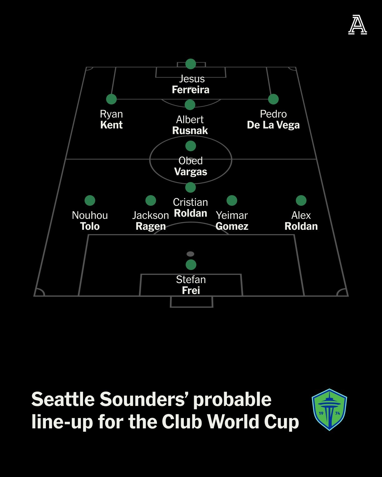 在过去的十年大部分时间里,西雅图海湾人主要采用4-2-3-1阵型,配备真正的边后卫和有创造力的内切边锋。但过去几年,球队已开始用更年轻、位置适应性更强的球员取代老将。因此,2025年西雅图海湾人更频繁地使用基础的3-4-3阵型,宽度由两名复古型的边前卫提供。前锋两侧是两名攻击型中场,他们能在肋部区域掌控比赛。