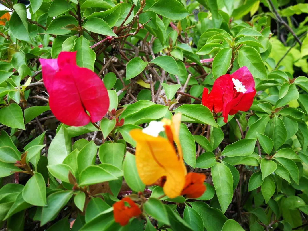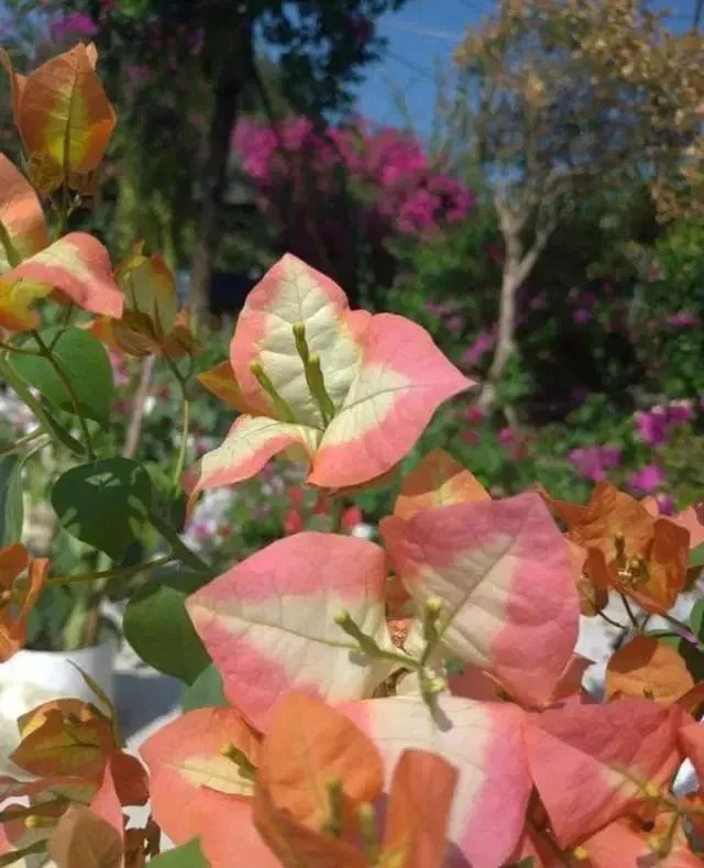 如果想要挑选一些“勤花”的三角梅品种,那就可以选择绿叶樱花、绿叶宫粉、百变红樱、西施怡景(重瓣)、重瓣红、重瓣紫、口红、加州黄金、巴西紫、大花浅紫、红樱、红粉佳人、绿叶玫瑰红、洒金叶粉和绿叶橙等。