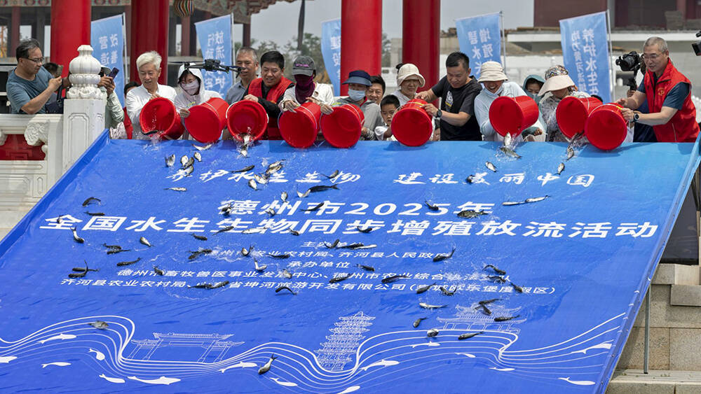 7日,德州市2025年全国水生生物同步增殖放流活动在齐河县举行。山东省农业农村厅、省渔业发展和资源养护总站、德州市农业农村局及德州各县(市、区)渔业主管部门、渔政执法部门有关人员、志愿者等近200人参加了活动。