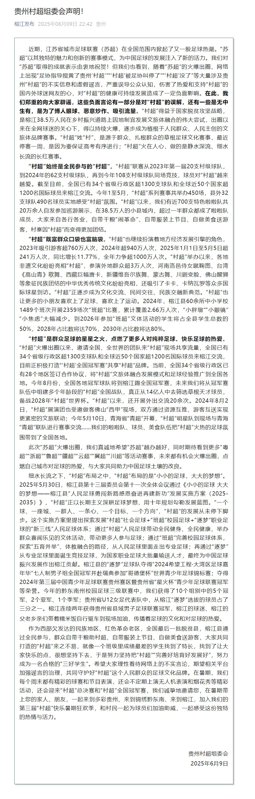 6月9日晚,贵州村超组委会发布声明: