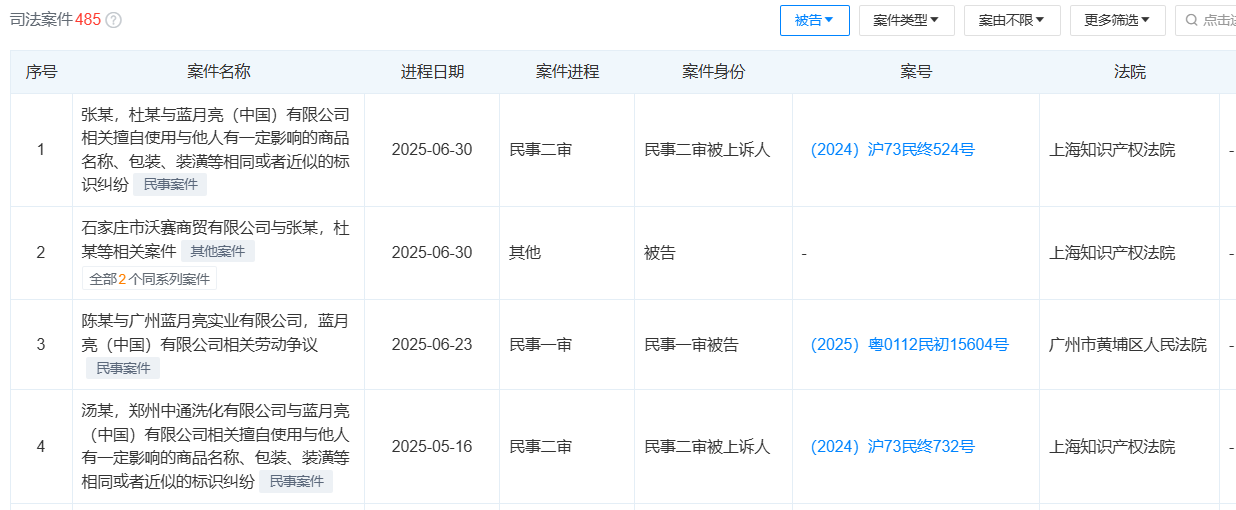近日,通过天眼查信息显示,蓝月亮(中国)有限公司【以下简称“蓝月亮”】接连陷入被告案件,其中有两起将在上海知识产权法院审理。2025年以来,蓝月亮以被告身份陷入12起官司,案件遍及广东、上海、河北。