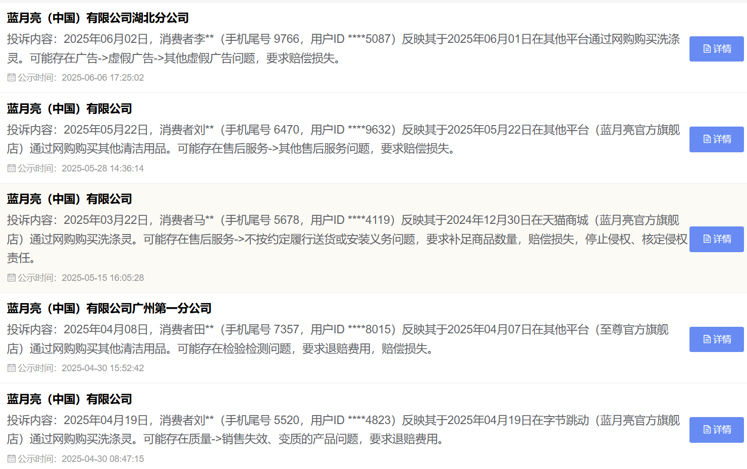此外,从全国12315消费投诉信息公示平台发现,有多条关于蓝月亮产品的投诉。