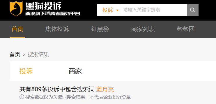 从黑猫投诉平台可以看到,关于“蓝月亮”关键词的投诉有809条。