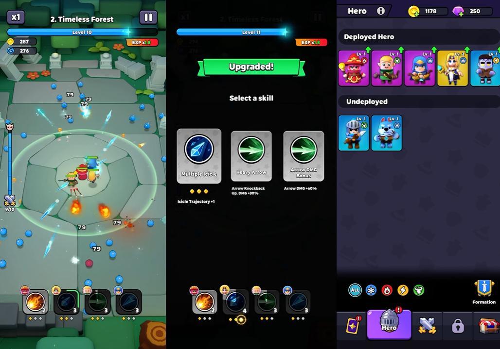 游戏采用了中心塔防的玩法。游戏开始时玩家可以选择2名英雄上场,应对从四面八方进攻的敌人。通过消灭敌人获得经验值,玩家将以Roguelike形式三选一选择奖励,可以选择上阵新英雄(根据战前的队伍搭配最多上阵5名英雄),或者选择为某个英雄强化技能。