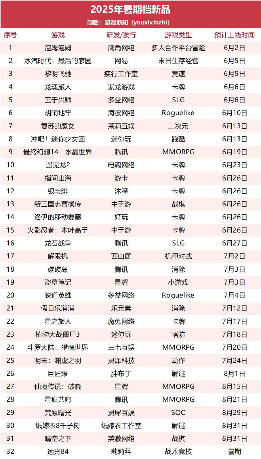虽然相比起去年的《地下城与勇士:起源》《燕云十六声》,今年准备在暑期上线重磅产品似乎要少一些,不过当中仍有一些值得关注的新品。比如鹰角网络推出了首款买断制的多人合作主机游戏《泡姆泡姆》,被视为国产主机游戏中「村里第二个大学生」的《明末:渊虚之羽》也准备在暑期上线。此外包括腾讯、网易、灵犀互娱、莉莉丝、沐瞳等公司都有可能在暑期发布新品的计划。