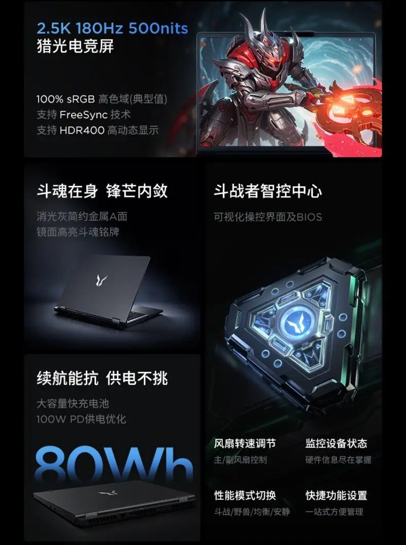 其他配置方面,它还搭载了 2.5K 180Hz 的电竞屏,支持最高 500nits 亮度,电池容量则是达到了 80Wh,还能支持 100W 的 PD 供电。它的机身还采用了金属 A 面,整体用料还算扎实。