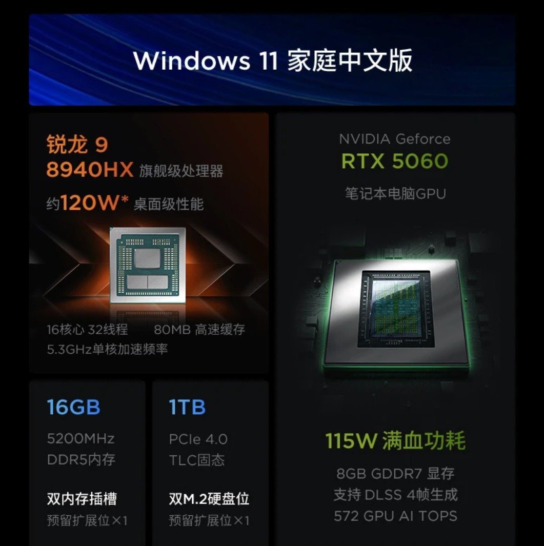 在配置方面,斗战者战 7000 锐龙版搭载了锐龙 7 8940HX 处理器,拥有 16 核心 32 线程,还能支持 120W 的功耗释放,性能据称可以看齐桌面级平台;它搭载的显卡是英伟达 RTX 5060 8GB,支持 115W 的满血功耗,整机功耗则是可以达到 200W。