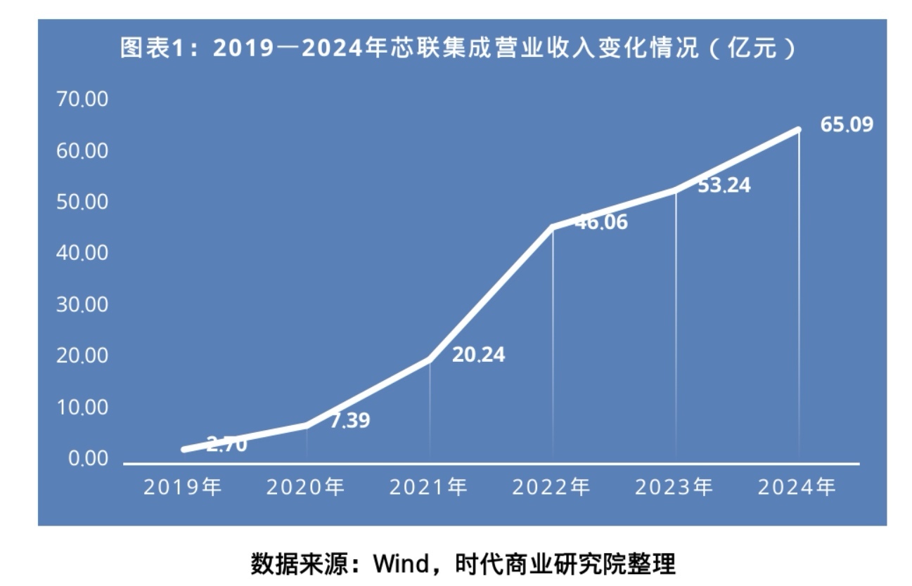 财报显示,2019—2024年,芯联集成的营业收入分别为2.70亿元、7.39亿元、20.24亿元、46.06亿元、53.24亿元、65.09亿元,营收在5年间增长超23倍,表现出较高的成长性。