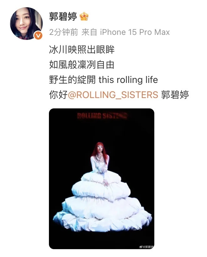 郭碧婷发文:“冰川映照出眼眸,如风般凛冽自由,野生的绽开,this rolling life,你好ROLLING_SISTERS郭碧婷。”