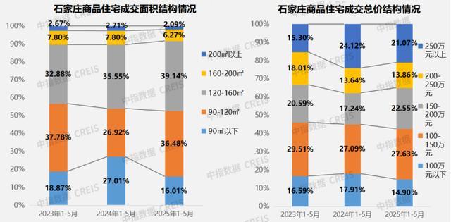 成交户型与价格:2025年1-5月120-160㎡的商品住宅成交量占整体成交量的比例最高,占比为39.14%。2025年1-5月总房款100-150万元的商品住宅成交量占整体成交量的比例最高,占比为27.63%。