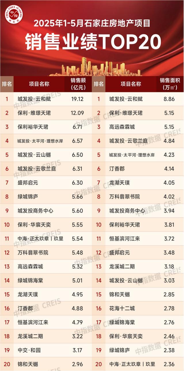2025年1-5月石家庄商品房销售金额TOP20项目共成交125.72亿元,入榜门槛为2.96亿元。其中城发投·云和赋项目以销售业绩19.12亿元位居榜首,保利·维璟天珺项目以12.09亿元的销售业绩位居第二,保利裕华天珺项目以6.71亿元的销售业绩位列第三。