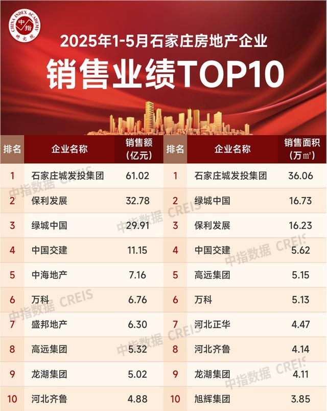 2025年1-5月石家庄房地产企业销售金额TOP10共成交170.31亿元,TOP10门槛值为4.88亿元。其中石家庄城发投集团以61.02亿元的销售业绩荣膺销售榜首位,保利发展以32.78亿元居榜单第二,绿城中国以29.91亿元位列第三。