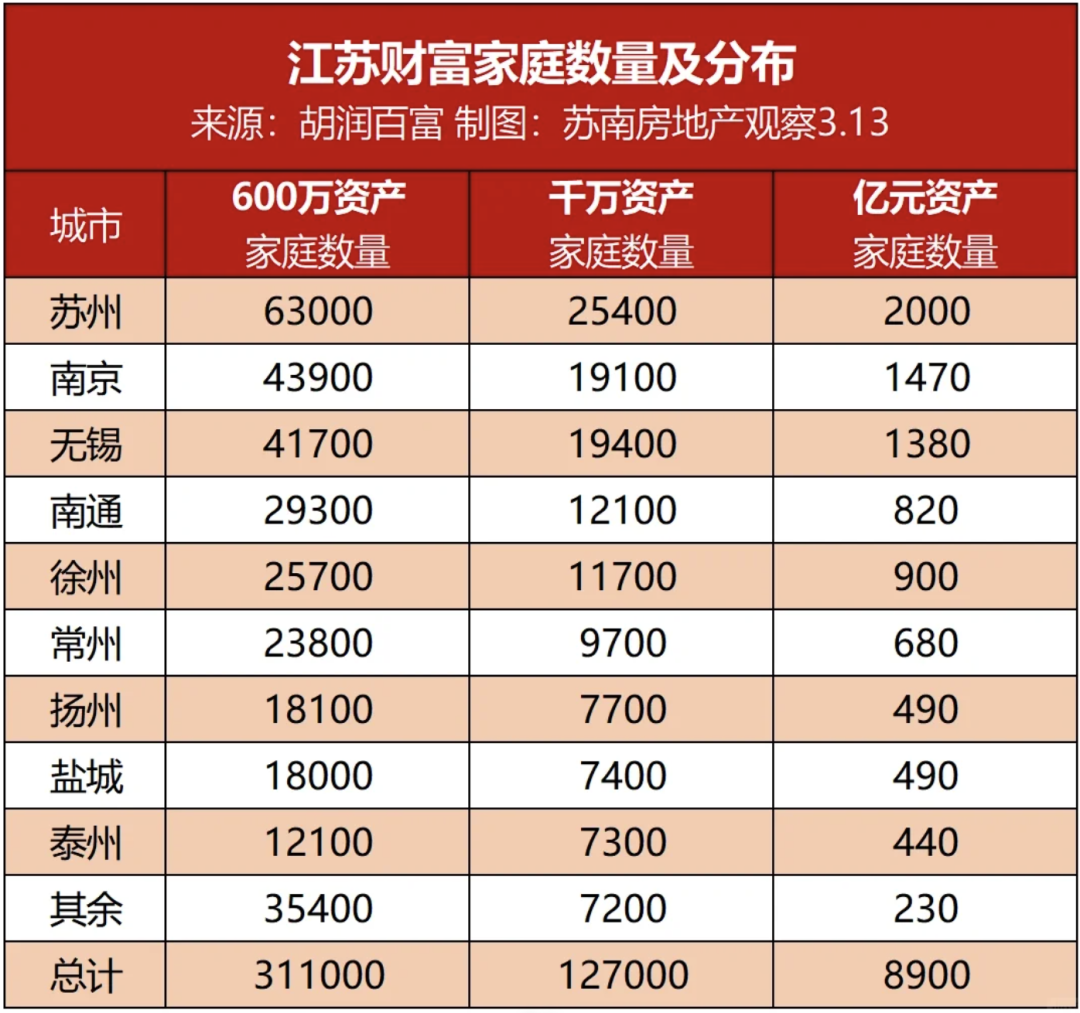 根据《2024胡润财富报告》,江苏省内资产过亿元的超高净值家庭有8900户。