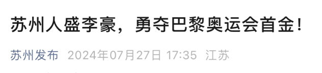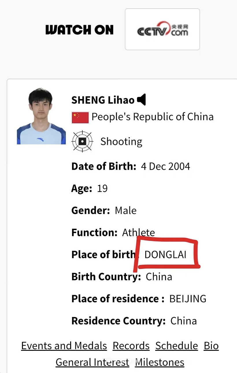 奥运会金牌得主盛李豪来自江苏,但在奥运官网选手资料里,盛李豪的出生地填的是东莱。
