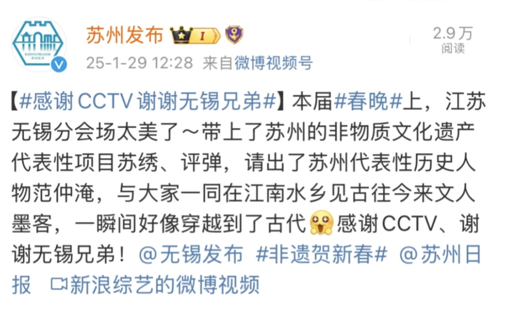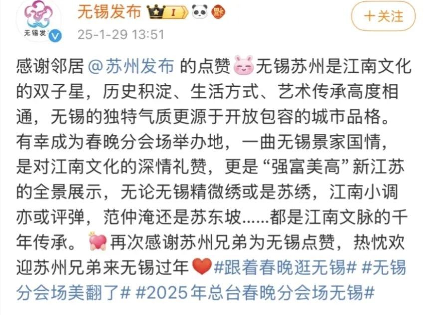 痛失春晚的苏州和喜提晚会的无锡两位尖子生在春节互秀肌肉友好互动,甚至沦为一番互联网美谈。