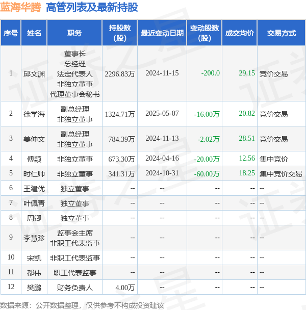 蓝海华腾近半年内的董监高及核心技术人员增减持详情如下:
