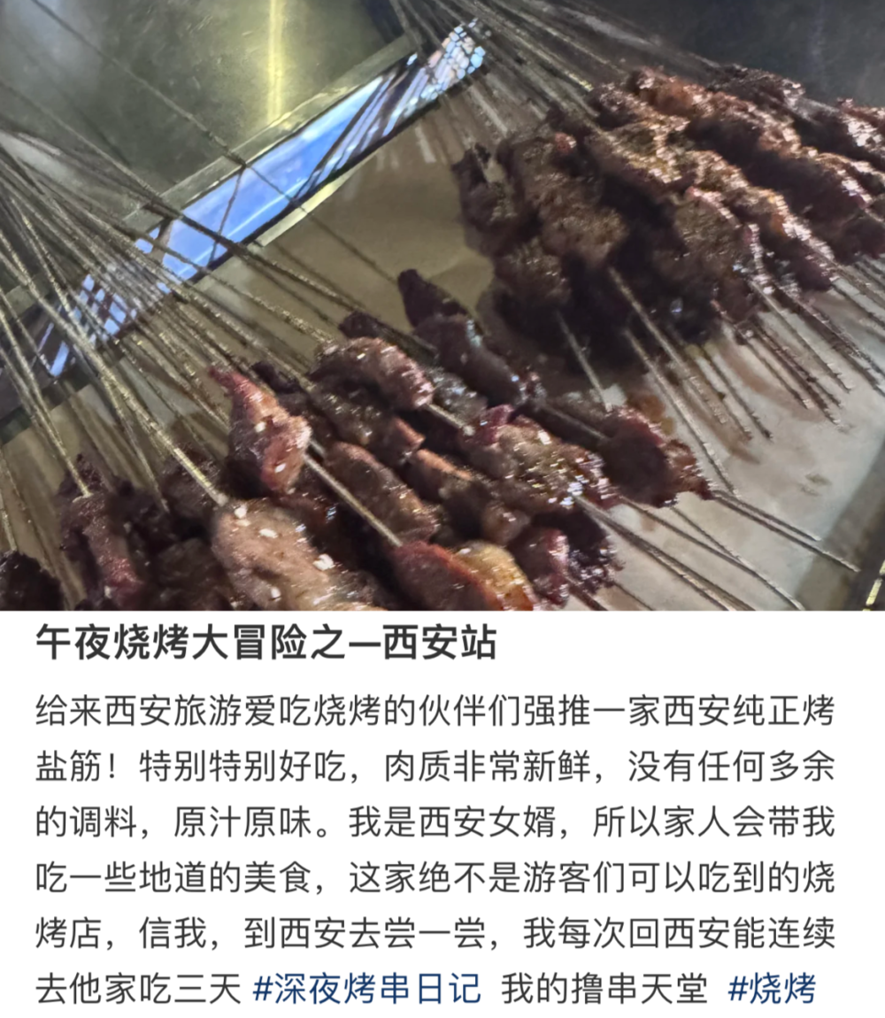上个月Stella去陕西旅游时,打卡的那家烤肉店地处知名景区附近,她排队一小时才吃上,门口聚集着大量和她一样的外地游客。“有人汉服妆造还没换下,还有推着行李箱的,不是准备走就是刚落地。”
