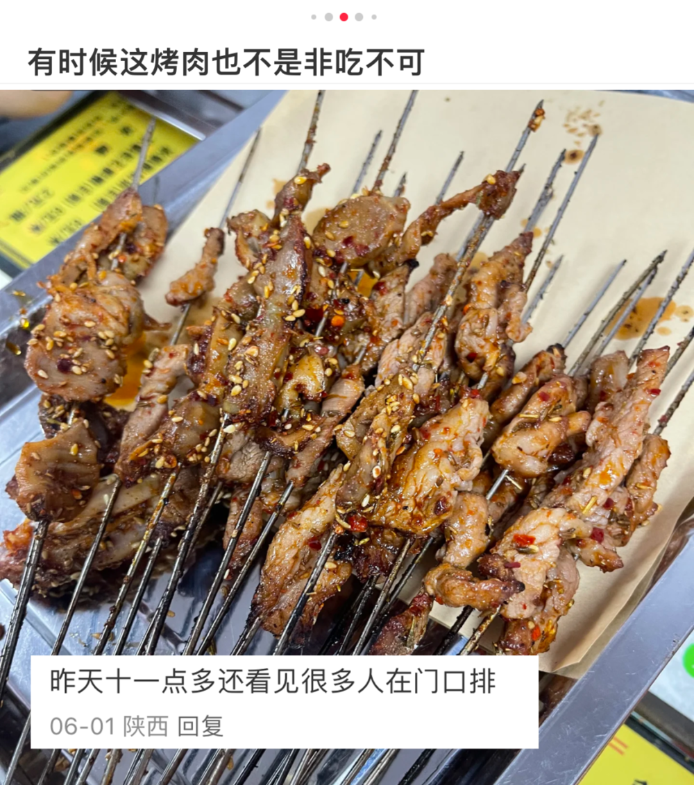 “某些畅销的肉串,卖到九点就沽清了,也没多余存货。这确实说明他们不卖隔夜冻货,品质有保证,但你也可能压根吃不到。”