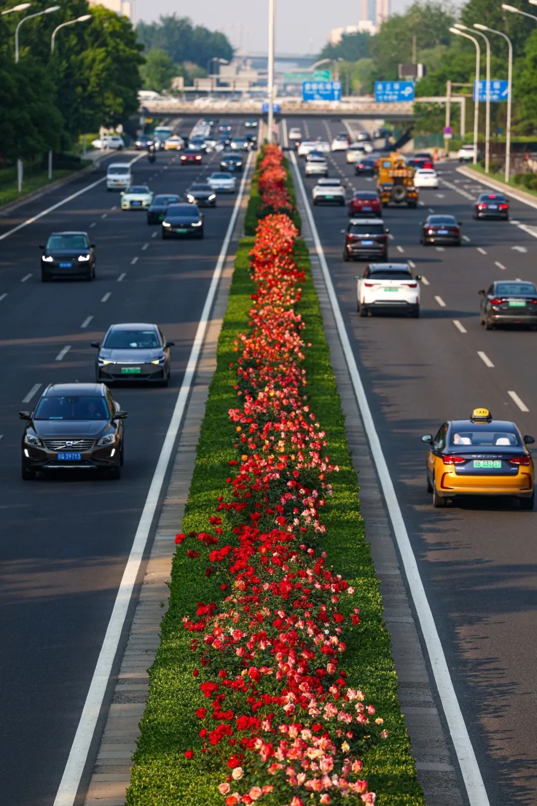 网友们摇下车窗,用手机定格这一路繁花,心里的某一刻也在感谢那个“在北京环路上种月季的人”。