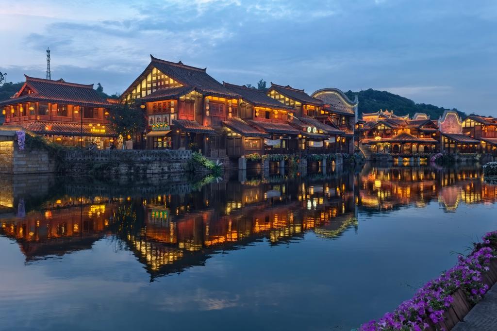 夜幕降临,李庄古镇华灯初上,灯火阑珊,水天辉映。新华社发(郑阳摄)
