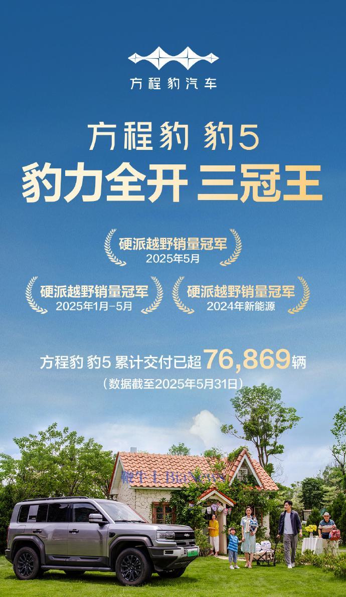 6月13日,比亚迪日前宣布,方程豹“豹 5”汽车在 2025 年 1-5 月累计交付超 76869 辆,成为该期间硬派越野销量冠军。