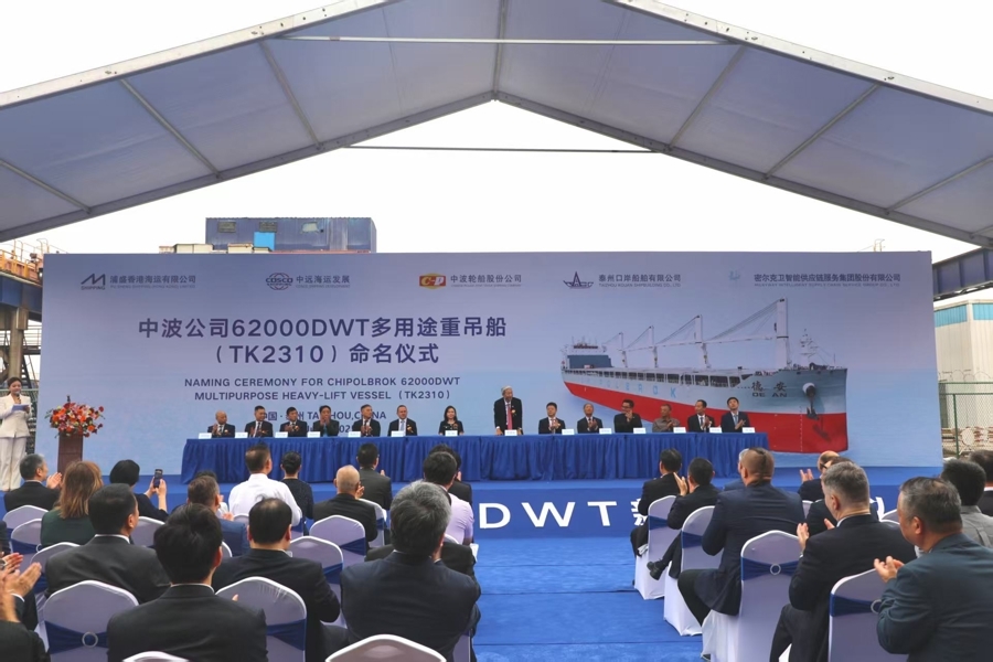 今日(6月13日),中波公司6.2万载重吨多用途重吊船系列的第7艘新船——“德安”轮,在江苏口岸船厂正式命名交付。