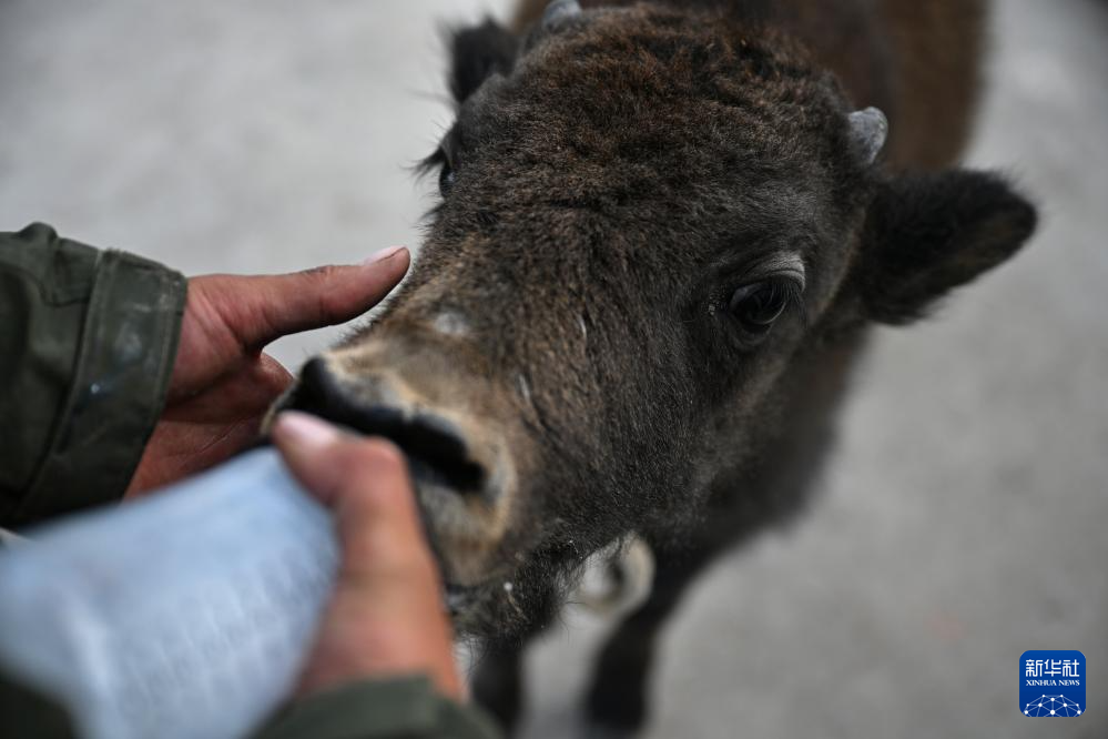 在羌塘国家级自然保护区核心区的玛伊野生动物管护站,管护员给被救助的小野牦牛喂奶(6月7日摄)。