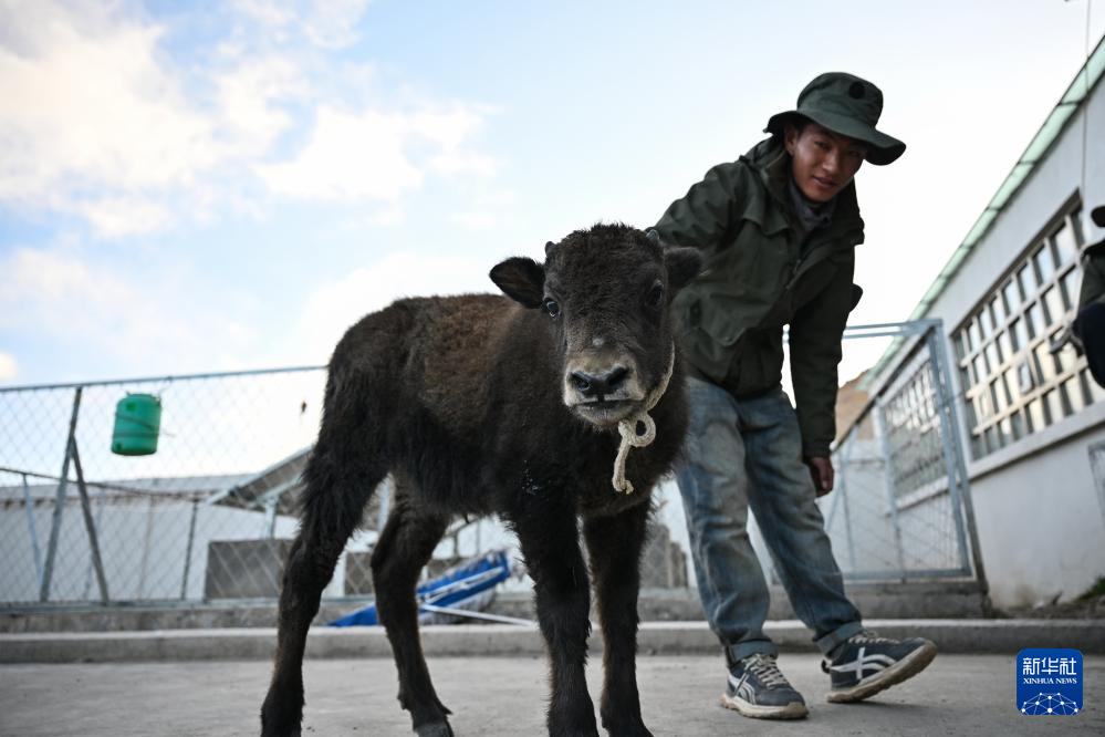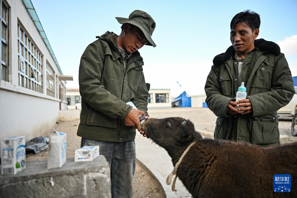 在羌塘国家级自然保护区核心区的玛伊野生动物管护站,两名管护员给被救助的小野牦牛喂奶(6月7日摄)。