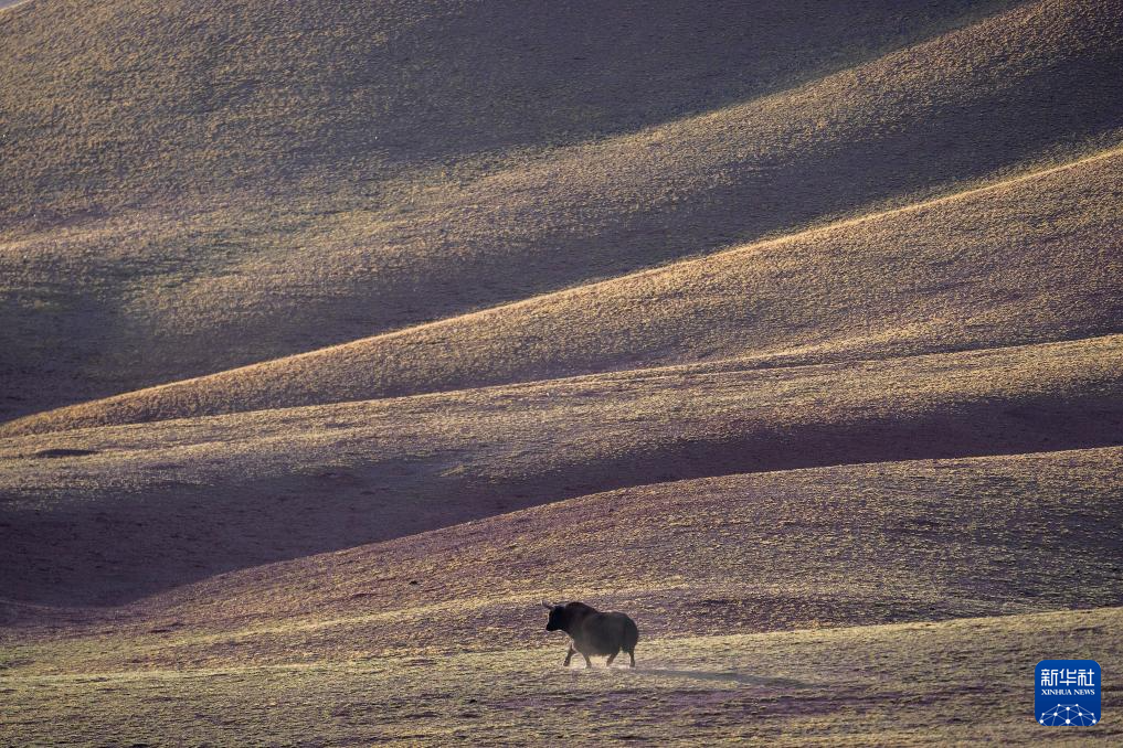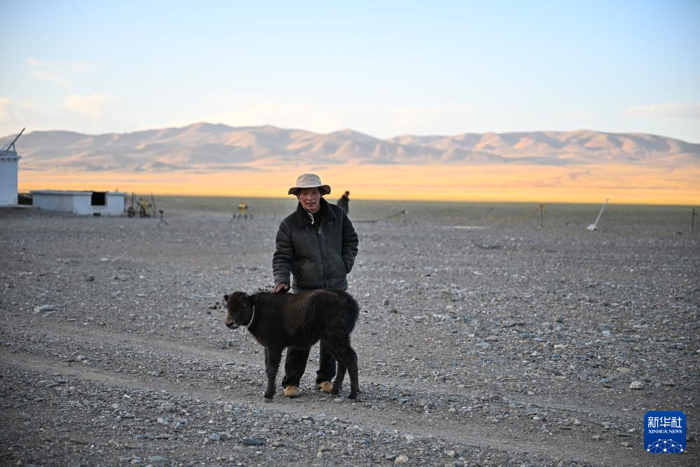 在羌塘国家级自然保护区核心区的玛伊野生动物管护站旁,管护员和被救助的小野牦牛一起散步(6月7日摄)。