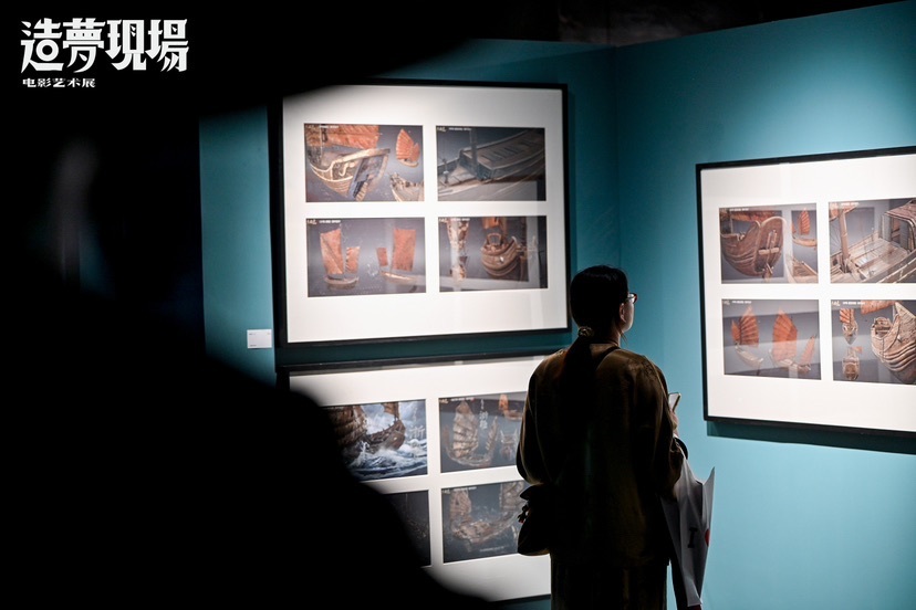 “《东极岛》是管虎、费振翔共同执导的电影,即将在8月8日上映。我们在这个展厅中呈现了《东极岛》的其中一个很核心的渔船的美术设计。这边是一个投影的装置,前面这里是一个电影中出现的渔船的模型,导演他们在拍摄素材的时候,在取景阶段拍摄的一段的影像。大家可以看到一个电影的创作者对一个环境从第一次看到它跟最后呈现出来的样子。”“造梦现场”电影艺术展策展人张博实介绍说,旁边两个模特展示的是两位主演,由吴磊扮演的阿荡跟朱一龙扮演阿赑的角色的两个服装的部分展示。