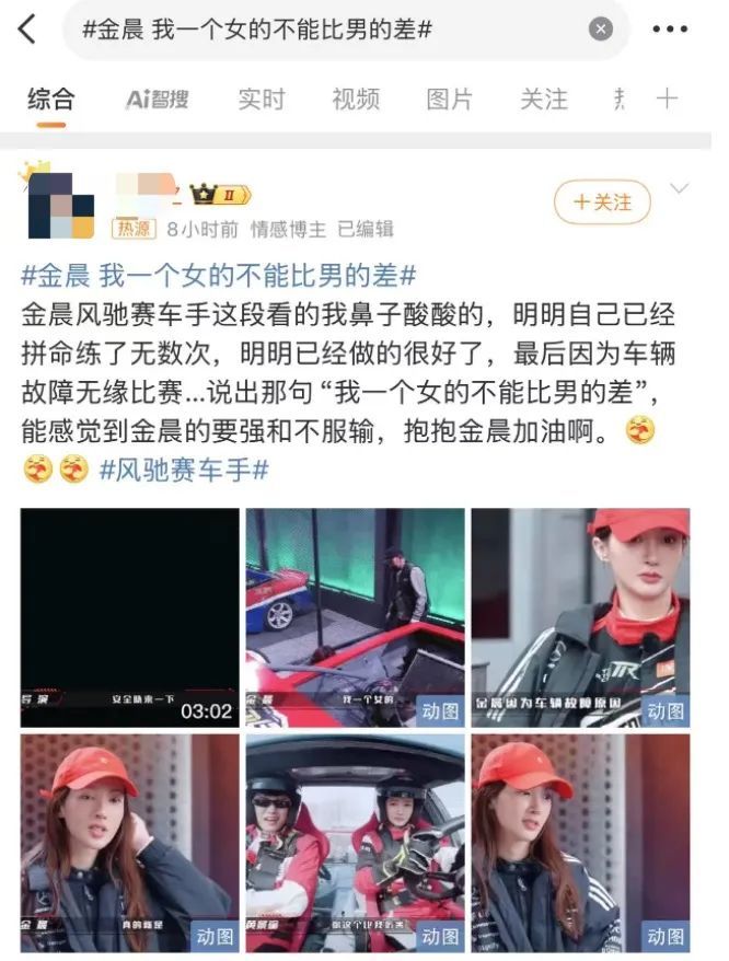 作为场上唯一的女明星赛车手,身材瘦小的金晨一改柔弱模样,即使在体能上远不及其它男明星赛车手,但她身上那股不服输的劲却快要冲破屏幕。