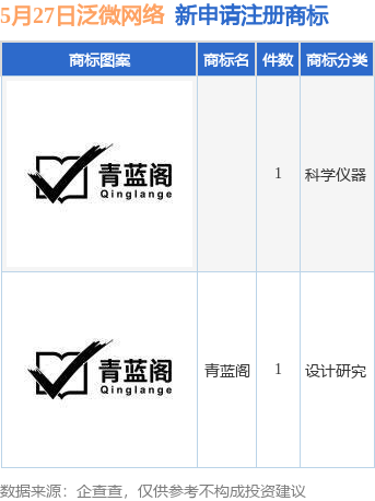 证券之星消息,根据企查查数据显示,近日泛微网络科技股份有限公司新提交“青蓝阁”等2件商标注册申请。商标申请详情如下: