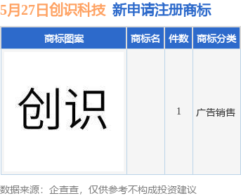 今年以来福建创识科技股份有限公司新申请注册商标1件,截止目前公司共持有注册商标70件,另有5件商标尚在注册申请中。