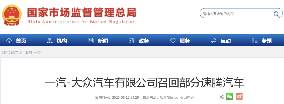 6月13日,国家市场监督管理总局发布召回公告,一汽-大众汽车有限公司根据《缺陷汽车产品召回管理条例》和《缺陷汽车产品召回管理条例实施办法》的要求,向国家市场监督管理总局备案了召回计划。
